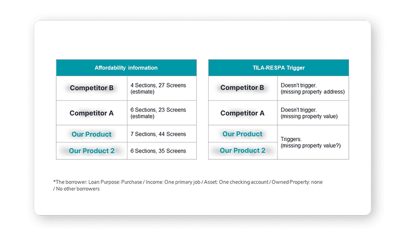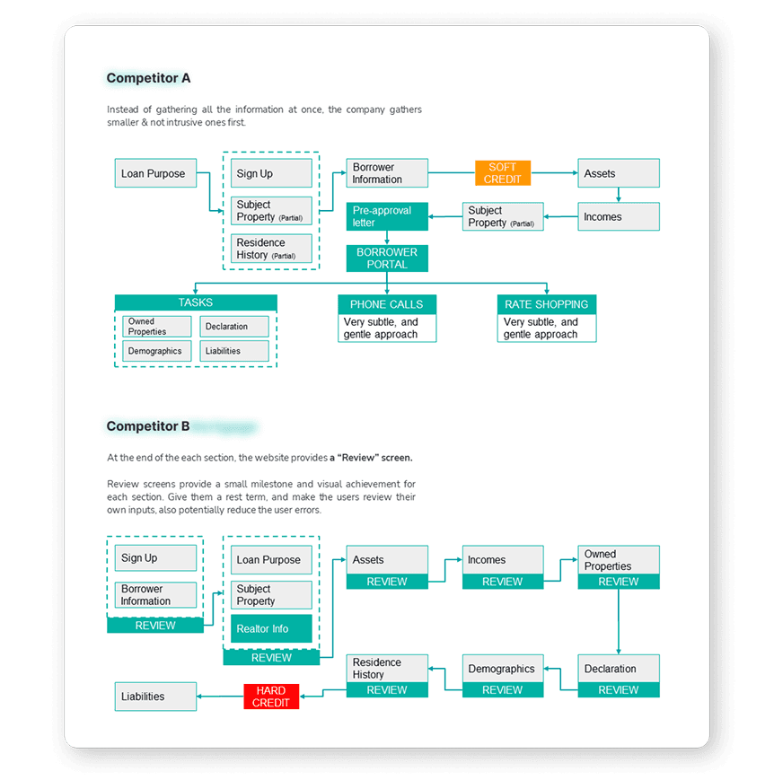 I audited five competing mortgage applications, mapping each step of their flows. Two distinct approaches emerged: some captured all data upfront before showing anything, while others brought a dashboard view after collecting basic loan information. Both approaches, shared a critical part, both did not risk completing a "defined application" and triggering the three-day loan estimate requirement. However, the existing product we were providing to customers triggered it. This was a significant finding that directly shaped the solution.