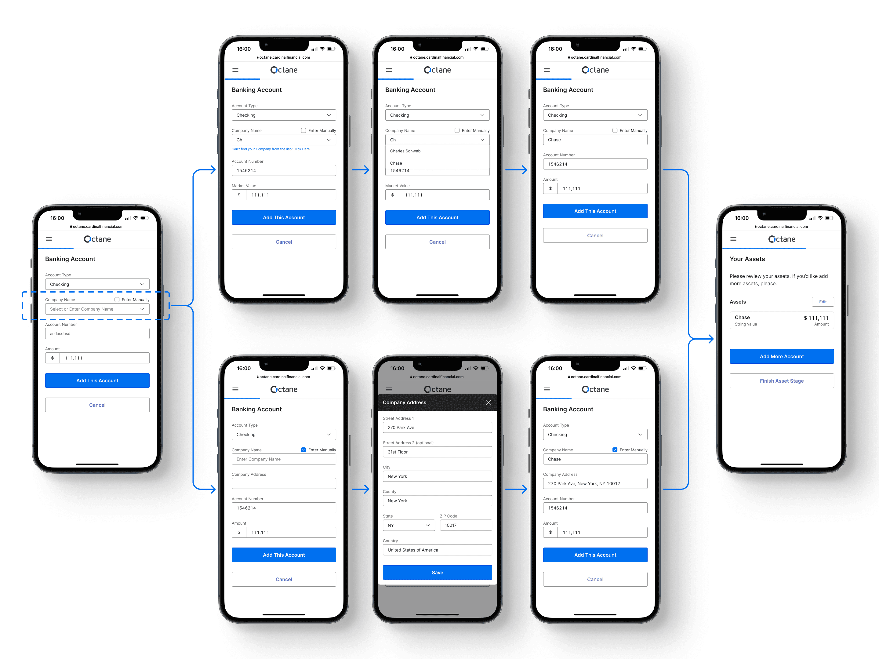 I introduced autocomplete for property addresses and bank information — fields where users were expected to recall precise details they often didn't have on hand. I added automatic calculations where values could be derived from information already entered from the prior sections only asking additional information. Each section ends with a review screen, giving users a checkpoint to verify their input before moving forward.